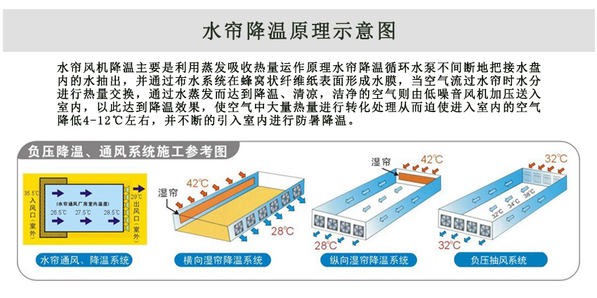 濕簾(水簾)降溫主要利用水蒸發(fā)過(guò)程中水吸收空氣中的熱量,使空氣溫度下降的物理學(xué)原理。在實(shí)際中于負(fù)壓風(fēng)機(jī)配套使用,濕簾裝在密閉房舍一端山墻或側(cè)墻上,風(fēng)機(jī)裝在另一端山墻或側(cè)墻上,降溫風(fēng)機(jī)抽出室內(nèi)空氣,產(chǎn)生負(fù)壓迫使室外的空氣流經(jīng)多孔濕潤(rùn)濕簾表面,使空氣中大量熱量進(jìn)行轉(zhuǎn)化處理從而迫使進(jìn)入室內(nèi)的空氣降低4-10,并不斷的引入室內(nèi)進(jìn)行防暑降溫。